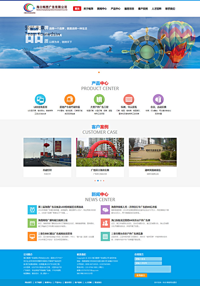 案例背景:海口暢想廣告有限公司自成立以來(lái),一直致力于戶外廣告行業(yè),多年來(lái)時(shí)時(shí)洞察市場(chǎng)需求,不斷將產(chǎn)品改進(jìn)升級(jí).現(xiàn)已發(fā)展成具有一定規(guī)模,集LED戶外光電工程、LED顯屏、LED戶外大型發(fā)光字工程、大型專業(yè)戶外廣告制作、專業(yè)房地產(chǎn)終端推廣包裝、戶內(nèi)外噴畫、吸塑雕刻、策劃設(shè)計(jì)、活動(dòng)慶典、會(huì)場(chǎng)布置等為一體的綜合性現(xiàn)代廣告制作公司。