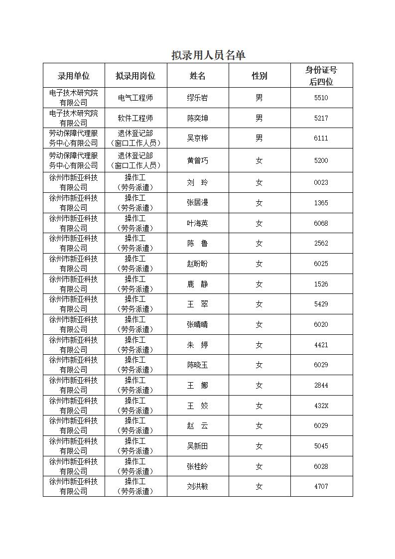 根據(jù)《徐州市國有資產(chǎn)投資經(jīng)營集團(tuán)有限公司招聘工作人員公告》相關(guān)要求,海鷗集團(tuán)所屬電子技術(shù)研究院有限公司、勞動(dòng)保障代理服務(wù)中心有限公司、徐州市新亞科技有限公司公開招聘工作已經(jīng)完成,現(xiàn)將擬錄用人員名單進(jìn)行公示。公示期自2023年5月6日起至5月11日止。如對(duì)公示對(duì)象錄用資格有異議,請(qǐng)于公示期內(nèi)向海鷗集團(tuán)組織人事部(紀(jì)檢監(jiān)察室)反映。