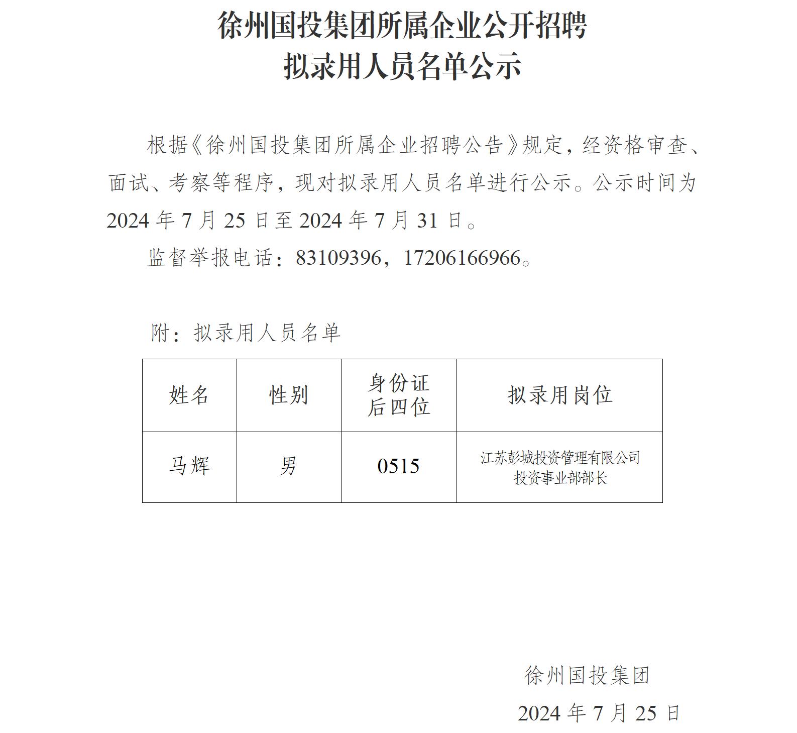 徐州國投集團所屬企業(yè)公開招聘擬錄用人員名單公示