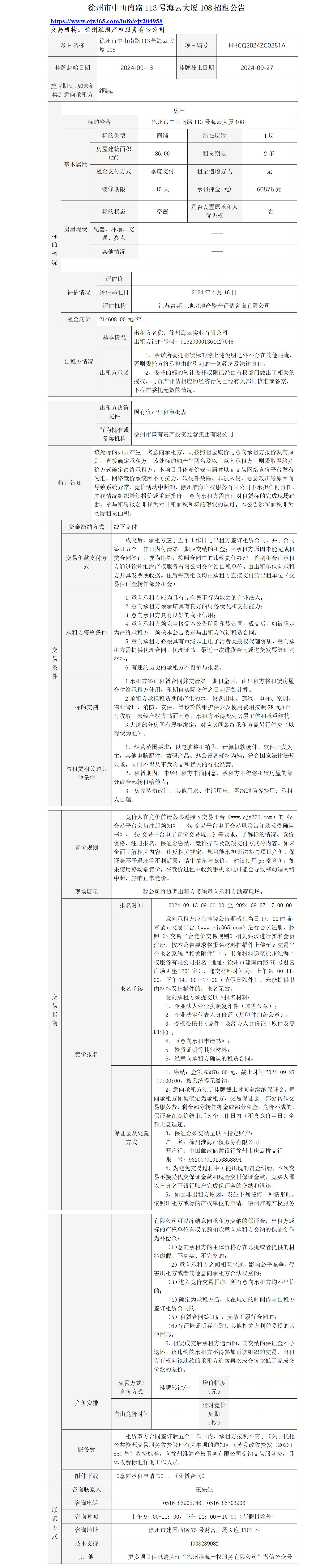徐州市中山南路113號(hào)海云大廈108招租公告