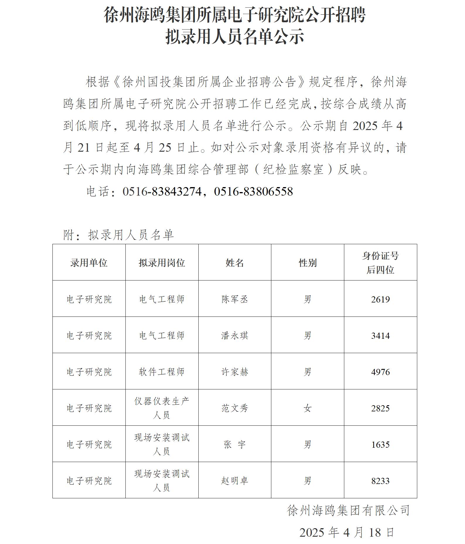 徐州海鷗集團所屬電子研究院公開招聘擬錄用人員名單公示