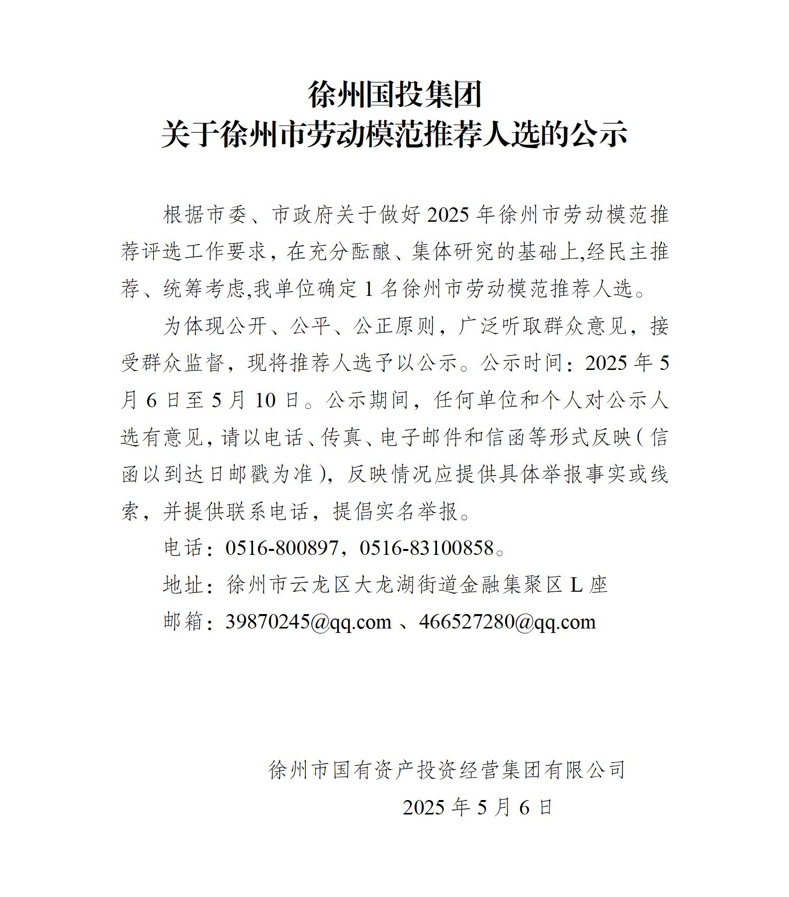 徐州國(guó)投集團(tuán)關(guān)于徐州市勞動(dòng)模范推薦人選的公示