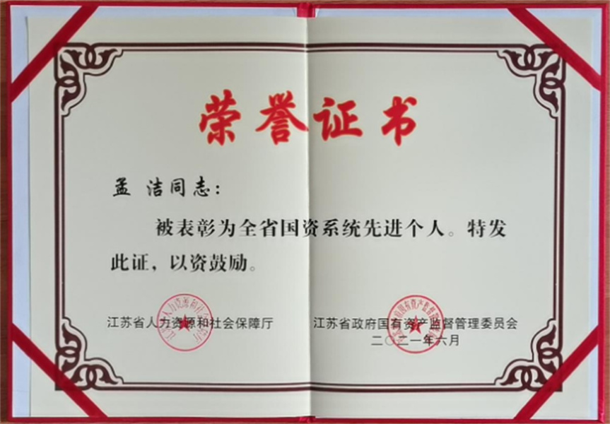 孟潔同志榮獲2021年“全省國資系統(tǒng)先進個人”榮譽稱號