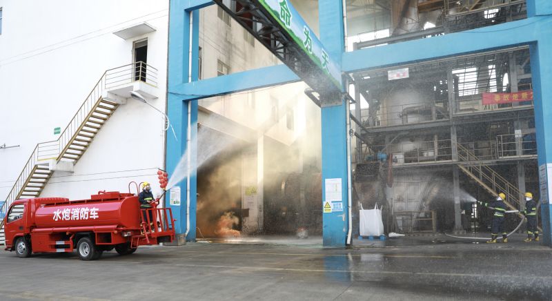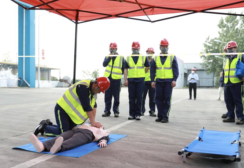 本次應(yīng)急演練活動現(xiàn)場位于危廢處置中心危險廢物焚燒車間,模擬場景設(shè)計為巡檢人員在更換窯頭噸桶廢液時,由于操作不當(dāng),回流管從收集桶中甩出至地面,廢液飛濺到巡檢人員額面部,造成灼傷。同時,廢液濺至回轉(zhuǎn)窯周邊遇熱燃燒,并點燃回流管不斷涌出的廢液。事故發(fā)生后,危廢中心應(yīng)急救援隊伍各司其職,消防與搶險救災(zāi)組使用滅火器、消火栓、消防水炮霧化滅火;警戒保衛(wèi)組對事故現(xiàn)場警戒;醫(yī)療救護(hù)組對受傷人員進(jìn)行心肺復(fù)蘇急救,將受傷員工外送就醫(yī);環(huán)境保護(hù)組打開應(yīng)急水池閘門,做好消防水及洗消水的收集工作。通過各現(xiàn)場應(yīng)急救援組織機構(gòu)協(xié)同努力,緊急情況得以解除,現(xiàn)場經(jīng)洗消檢驗后恢復(fù)正常狀態(tài)。