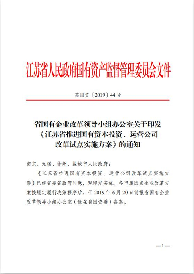 5.4月25日,省國有企業(yè)改革領導小組辦公室印發(fā)《江蘇省推進國有資本投資、運營公司改革試點實施方案》,徐州國投集團被確定為江蘇省首批國有資本投資公司試點企業(yè)。