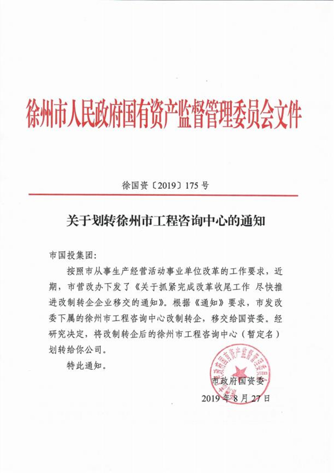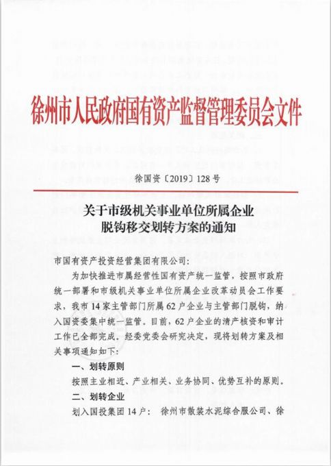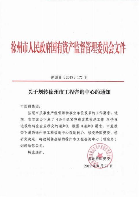 10.7月4日,市國資委印發(fā)《關于市級機關事業(yè)單位所屬企業(yè)脫鉤移交劃轉(zhuǎn)方案的通知》(徐國資〔2019〕128號),決定將徐州市商辦工業(yè)公司等14家企業(yè)劃入國投集團。8月27日,市國資委印發(fā)《關于劃轉(zhuǎn)徐州市工程咨詢中心的通知》(徐國資〔2019〕175號),決定將改制轉(zhuǎn)企后的徐州市工程咨詢中心(暫定名)劃轉(zhuǎn)給國投集團。