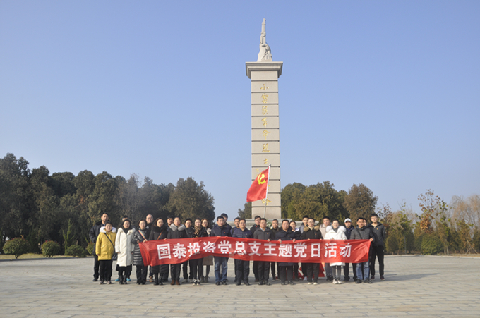 為進一步學(xué)習(xí)貫徹黨的十九大及十九屆四中全會精神,貫徹落實習(xí)近平新時代中國特色社會主義思想,圍繞“不忘初心、牢記使命”工作部署,12月24日上午,國泰投資黨總支及各所屬黨支部赴集團公司“愛國主義教育實踐基地”——新沂市小窯頭烈士陵園開展“緬懷英烈明愛國初心,學(xué)深黨史擔(dān)強企使命”主題黨日活動。黨總支及所屬支部全體黨員、積極分子及中層以上非黨員干部參加活動。