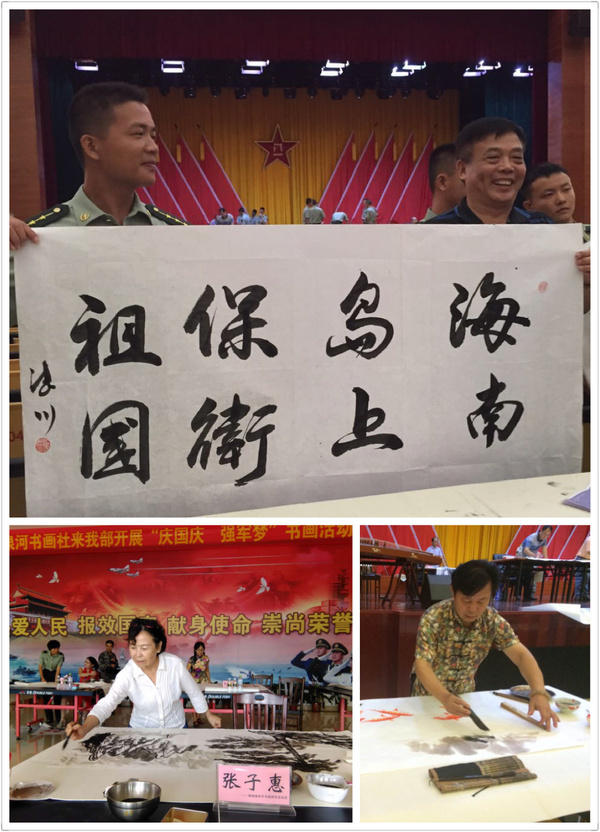 經(jīng)過約一個(gè)半小時(shí)的路程,大家到達(dá)了今天活動(dòng)目的地-省軍區(qū)某部,部隊(duì)首長(zhǎng)和人民子弟兵早早的在機(jī)關(guān)辦公樓前列隊(duì)等候萬泉河書畫社的各位書畫家老師們,爾后,部隊(duì)首長(zhǎng)致歡迎辭,董德川社長(zhǎng)講話和進(jìn)行書畫作品贈(zèng)送儀式。集體合影結(jié)束后大家觀看匯報(bào)片并參觀辦公樓、參觀部隊(duì)文化活動(dòng)中心與官兵交流進(jìn)行指導(dǎo)